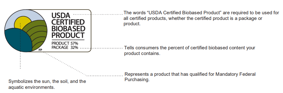 The USDA Certified Biobased Product Label displays a product's biobased content, which is the portion of a product that comes from a renewable source, such as plant, animal, marine, or forestry feedstocks. Utilizing renewable biobased materials displaces the need for non renewable petroleum-based chemicals. Biobased products are cost-comparative, readily available, and perform as well as or better than their conventional counterparts.